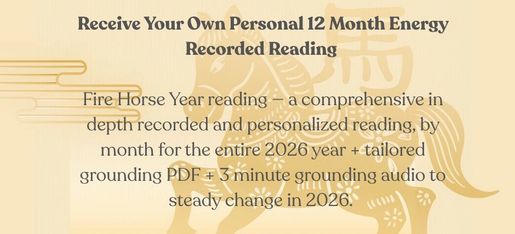 Receive a 30-45 minute recorded energy reading plus a tailored 6–10 page PDF and grounding audio to help you steady and harness the bold Fire Horse energy all year. Limited monthly spots — $195; click to book your reading to get ahead of the fire horse energy and help settle this powerful shift!